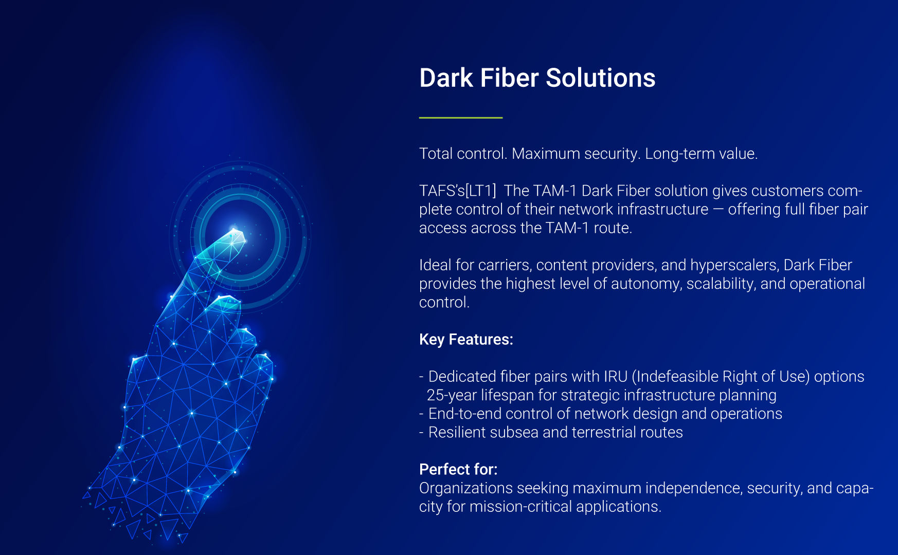 TAFS’s[LT1] The TAM-1 Dark Fiber solution gives customers complete control of their network infrastructure — offering full fiber pair access across the TAM-1 route.