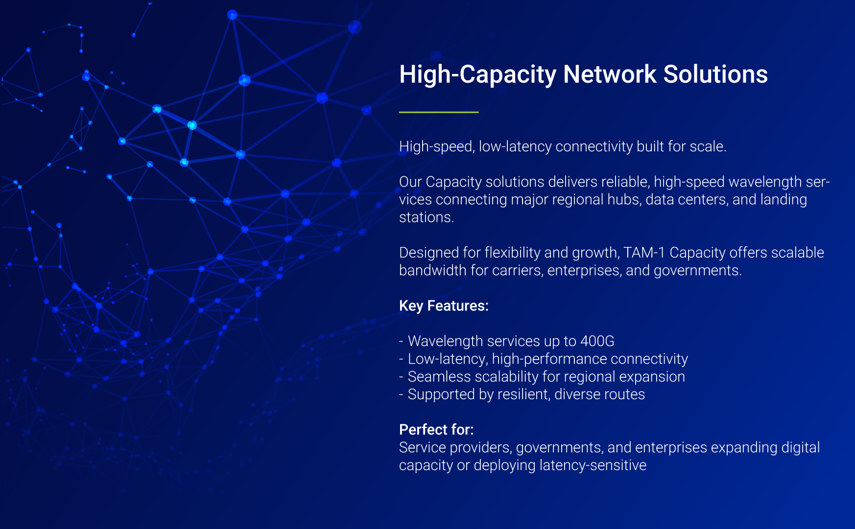 Designed for flexibility and growth, TAM-1 Capacity offers scalable bandwidth for carriers, enterprises, and governments.