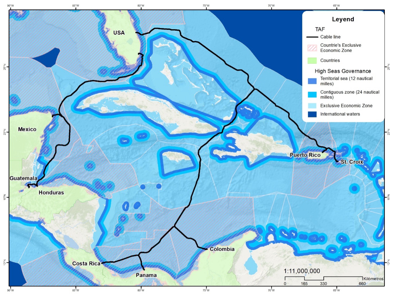 Figura 2. Aguas internacionales y aguas por territorio, por los que pasará el Sistema de Fibra Óptica TAFS