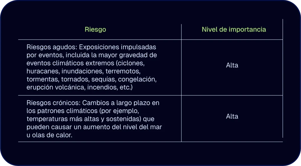 La Tabla 5 ilustra los riesgos físicos según el Grupo de Trabajo sobre Divulgaciones Financieras Relacionadas con el clima (TCFD por sus siglas en inglés) y su importancia dentro del contexto del proyecto de TAFS:
