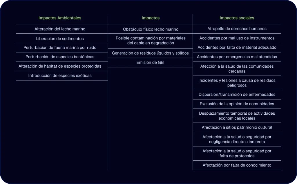 Se identificó que este impacto se podría presentar por la necesidad contar con mano de obra para la instalación del cable, por lo cual, es prioritario garantizar la no afectación de los derechos humanos. La afectación de los derechos humanos vulnera el éxito, la sostenibilidad de la empresa a largo plazo y las condiciones justas, seguras y equitativas de los trabajadores.