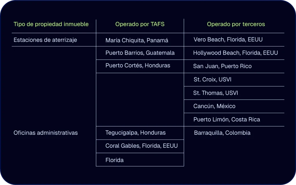 En dichas ubicaciones, se prevé la construcción de estaciones de aterrizaje para las operaciones del proyecto. Para el resto de los aterrizajes, se utilizará infraestructura existente de terceros. En este sentido, en la siguiente tabla se encuentran listadas las estaciones de aterrizaje y oficinas operativas asociadas a las operaciones de TAFS, ya sea que estén operadas de manera directa por TAFS o por una tercera parte.